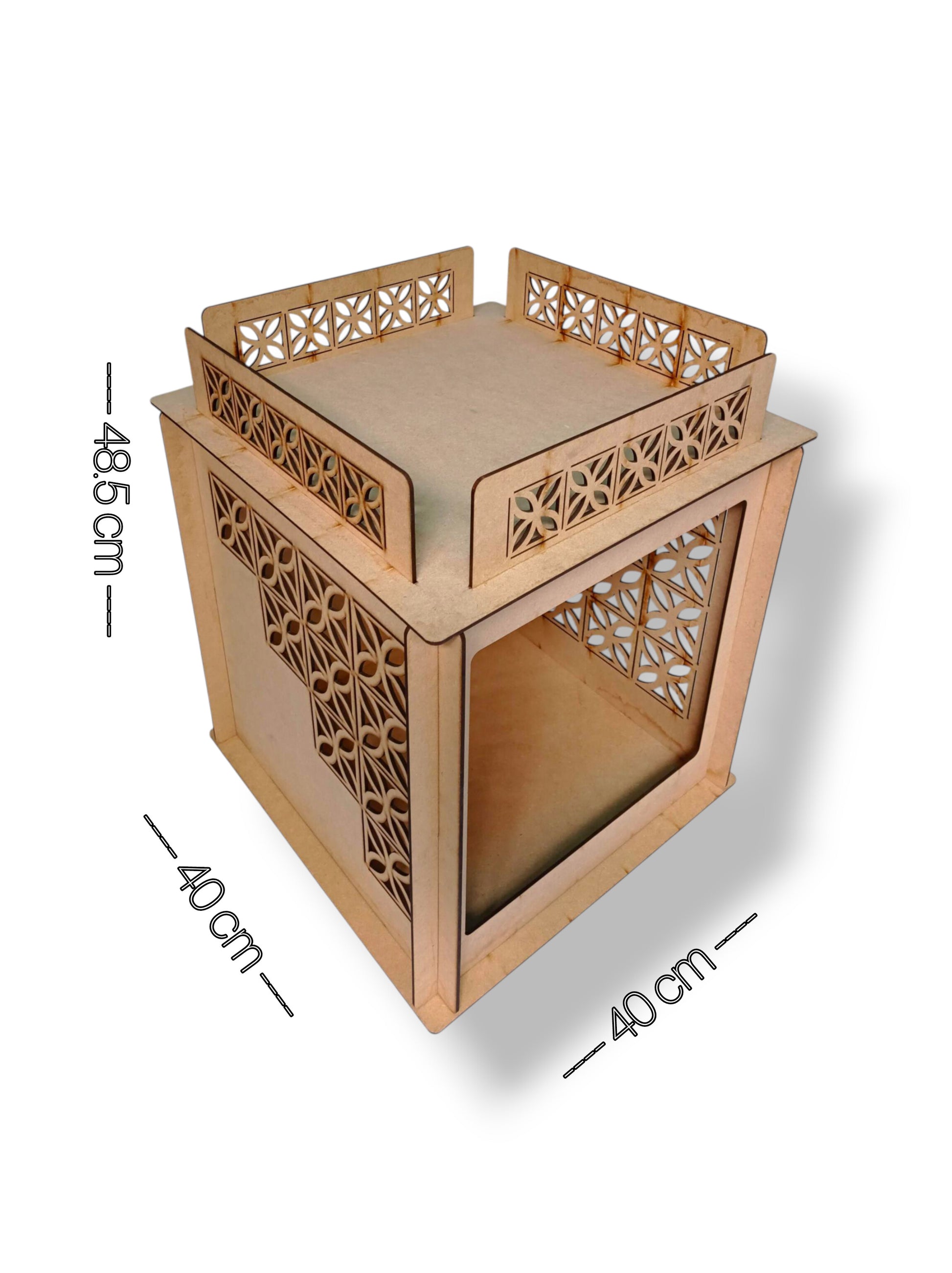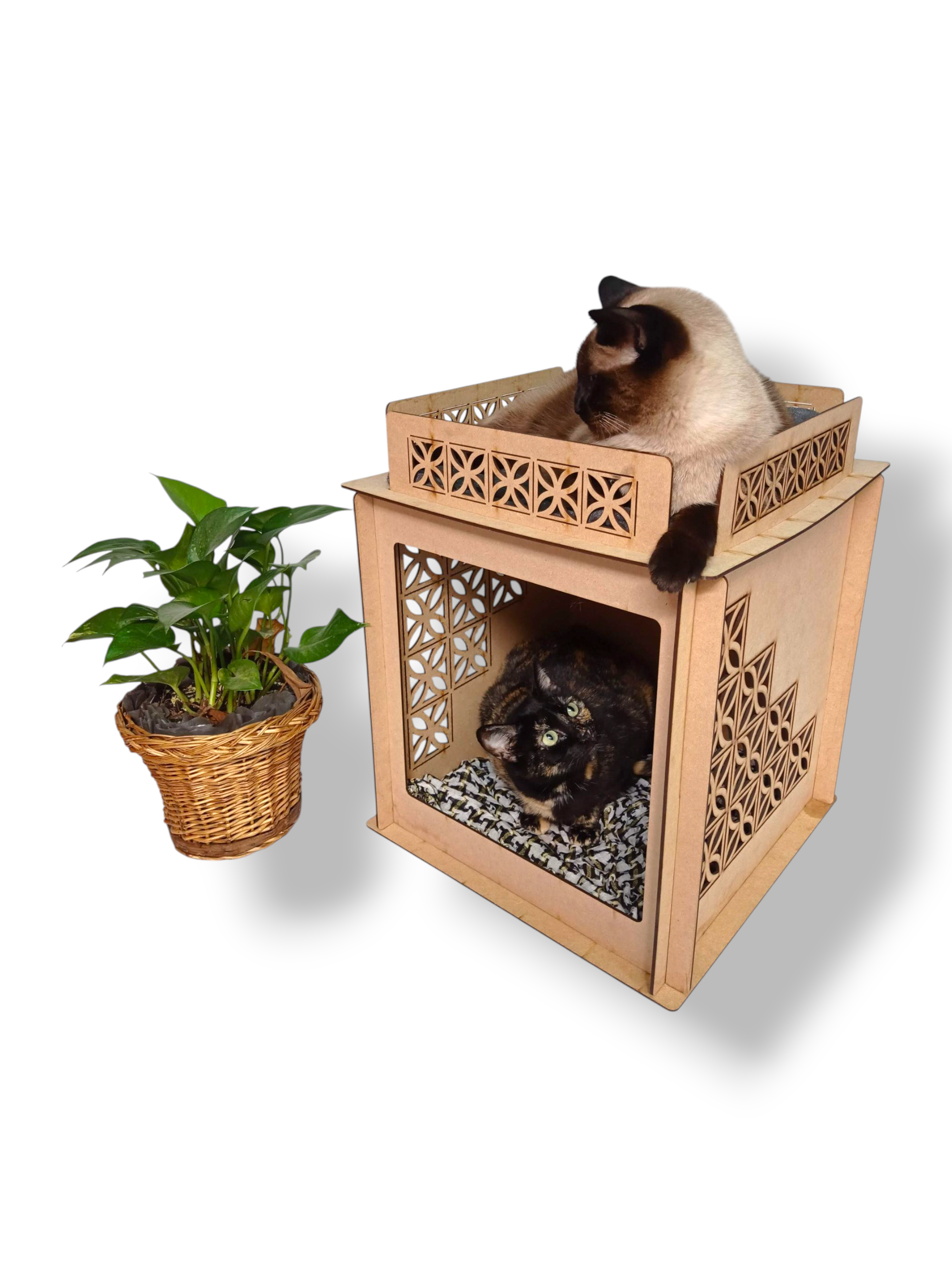 Esta casa en forma de cubo cuenta con delicadas celosías laterales que ofrecen ventilación y privacidad, mientras que el techo, con un pequeño barandal, se convierte en el lugar perfecto para que tu gato descanse y observe su reino.